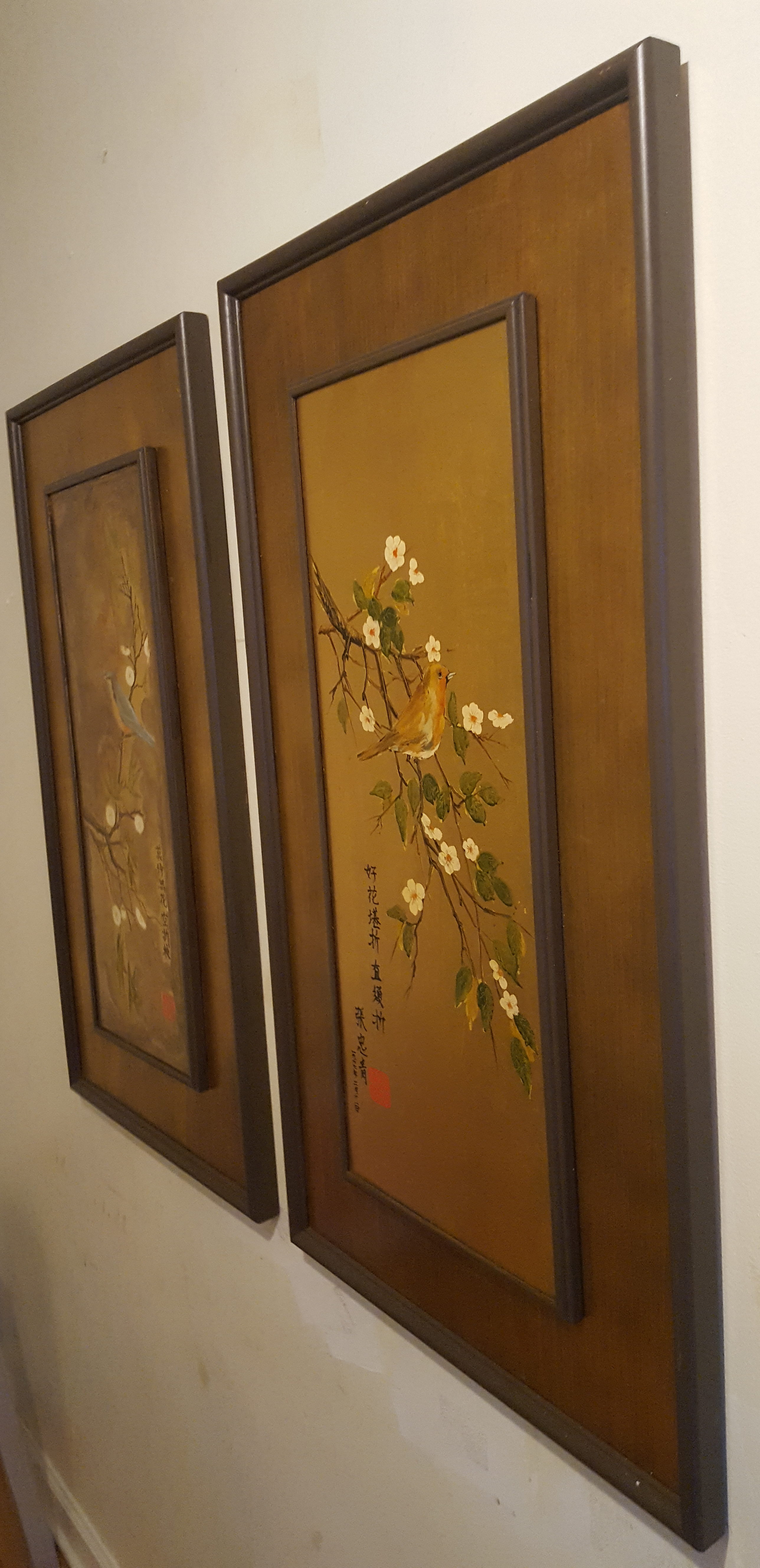 Comely Chinese Bird & Cherry Blossom Tree Painting. Complete with pristine golden paint backdrops and classy calligraphy, this will make a welcome addition to your wall space!