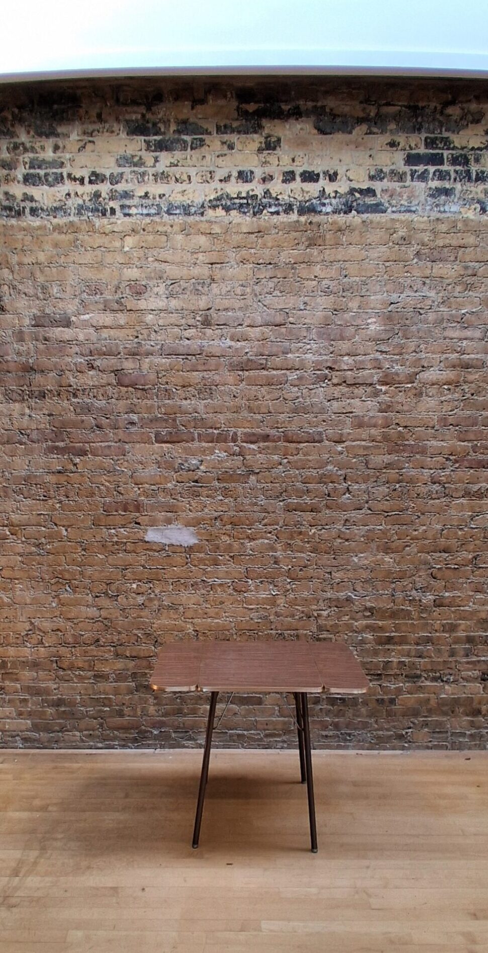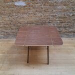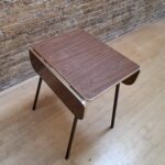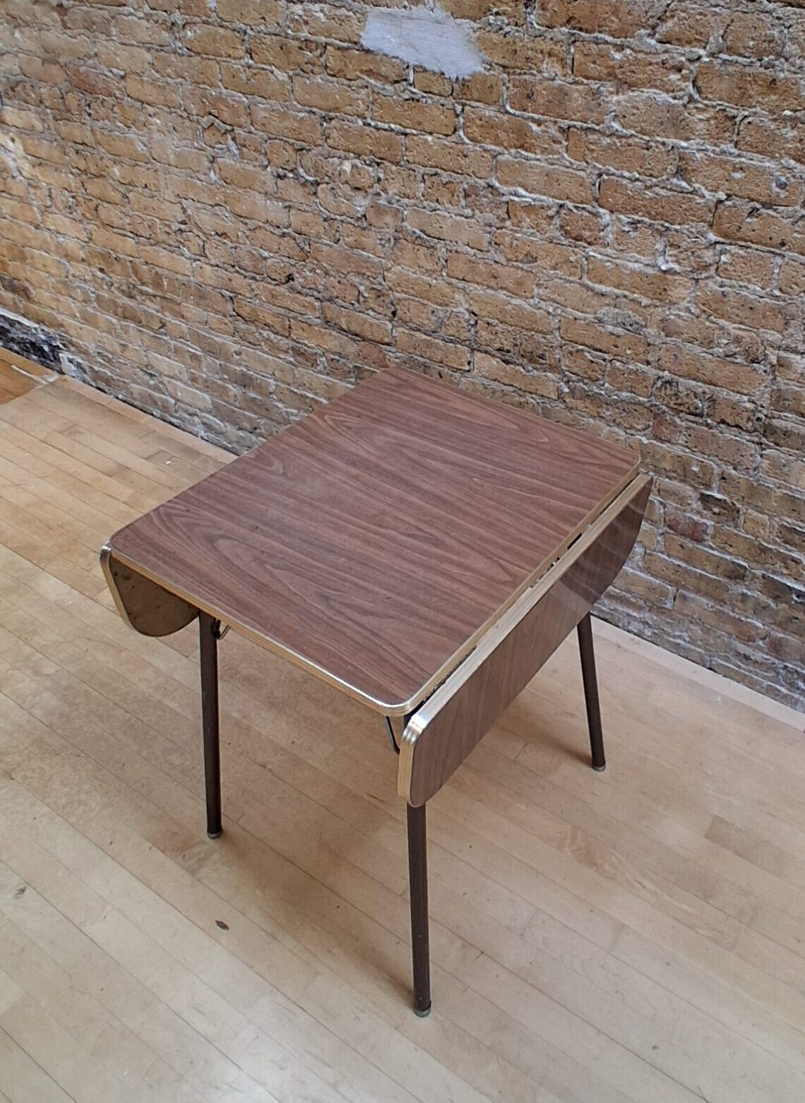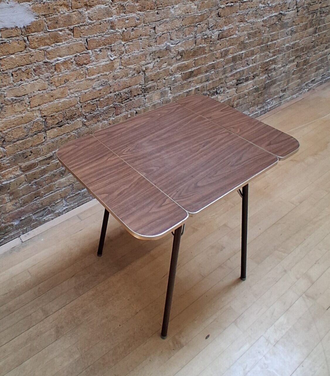 Handsome MCM table featuring a laminate woodgrain design, great fit for any lounge or living space.